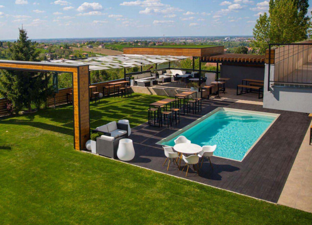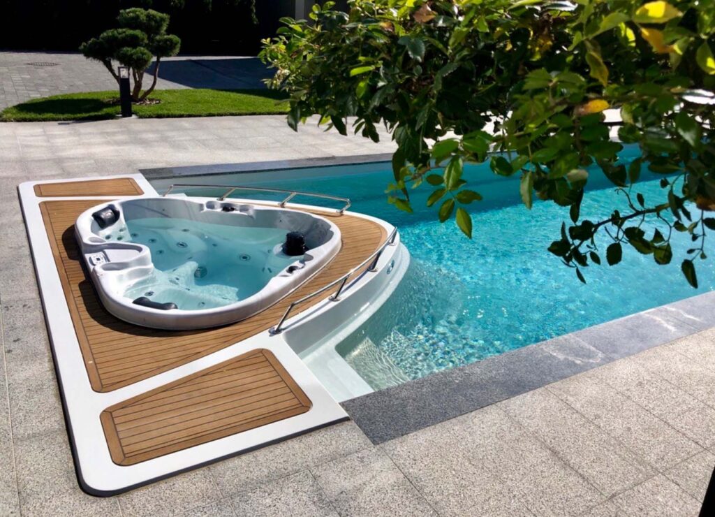 En pool med integrerat spa – inspirerad av båtliv och hav. Den här poolen har en unik design med extra lyxiga detaljer. Vattenmunstycken i fören ger dig en känsla av att stå på däck med vågor kring båten. Runt bubbelpoolen är ett däck i teak och rostfri reling.