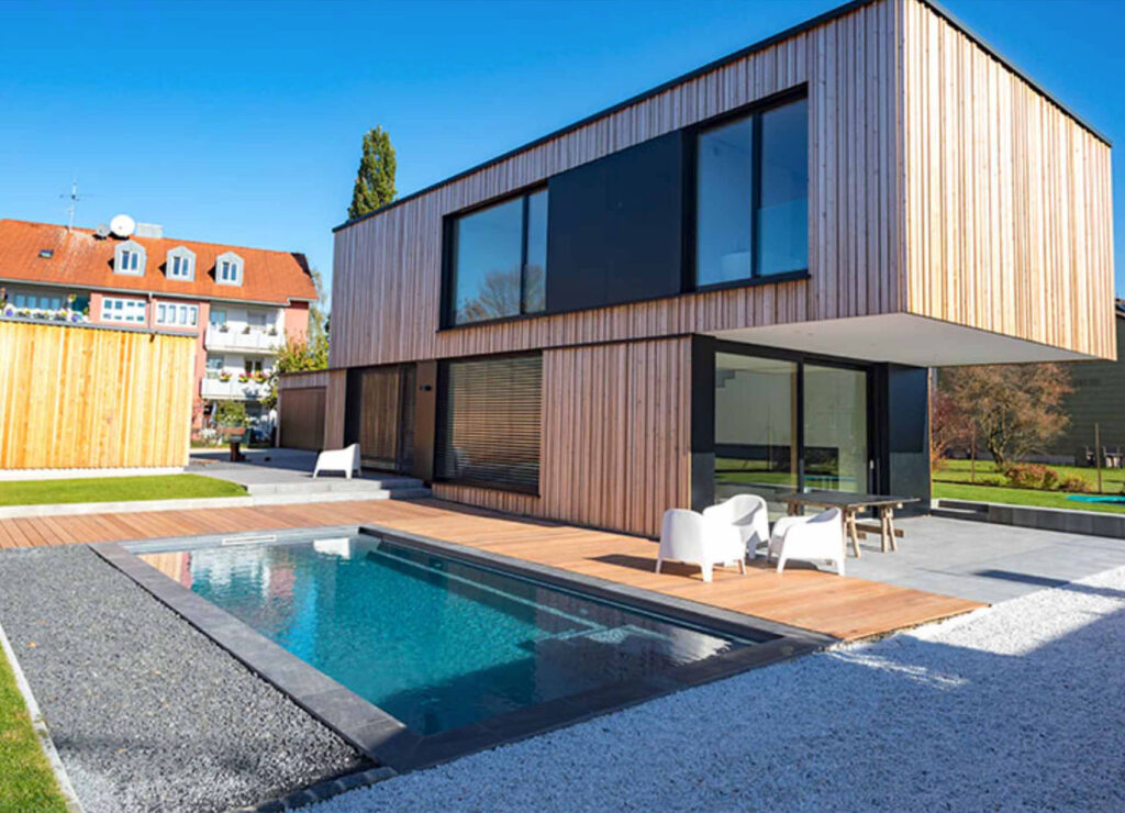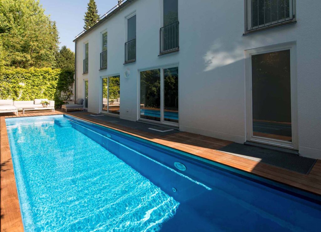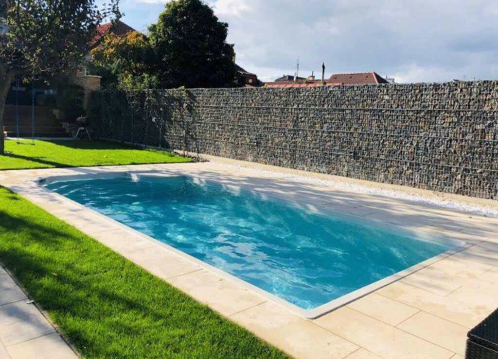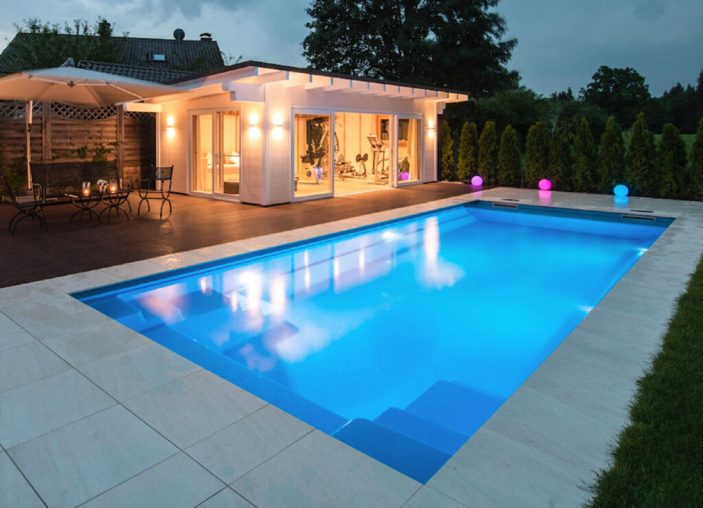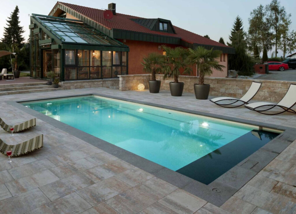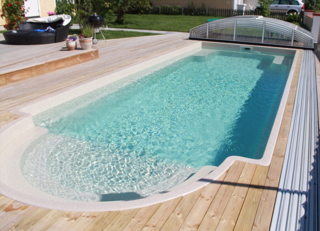 Nya poolen Classic har en trappa längs vänstersidan med en hel relaxbänk i samma gavel. Så att du kan sitta och njuta av kvällssolen eller slappa efter simpasset. Ytan på trappan och