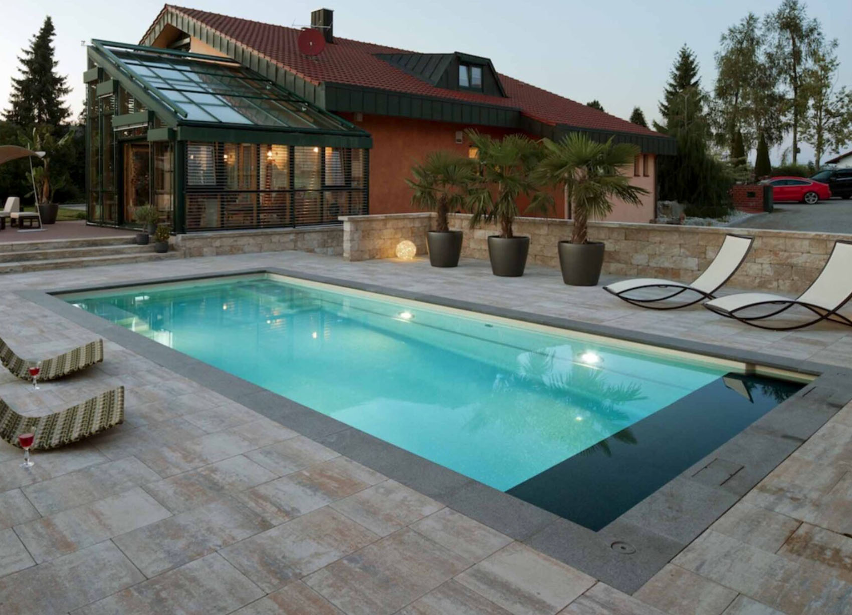 Poolen har en sluttande botten och har därför olika djup i olika delar. Det uppskattas av alla, inte minst barn och äldre personer. Två avslappningszoner och en bred integrerad trappa garanterar trygghet när man ska gå i och ur bassängen. På poolens långsida finns en steglist placerad för att barn ska kunna ta en paus, den gör det också lättare för vuxna att gå ur poolen var som helst Trainerpoolerna görs med en nya kolfibertekniken, läs mer om denna innovativa teknik. XL och XXL Trainer är förberedd för RolloCover.