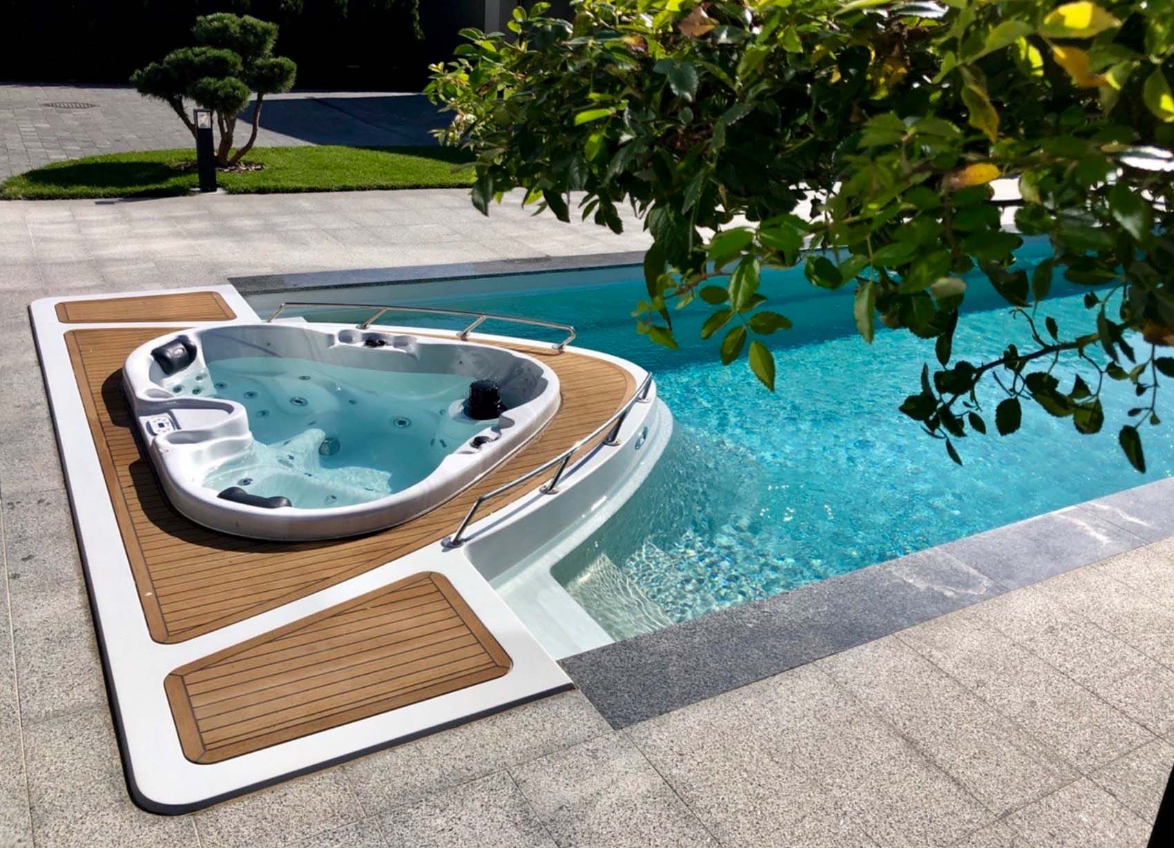 En pool med integrerat spa – inspirerad av båtliv och hav. Den här poolen har en unik design med extra lyxiga detaljer. Vattenmunstycken i fören ger dig en känsla av att stå på däck med vågor kring båten. Runt bubbelpoolen är ett däck i teak och rostfri reling.